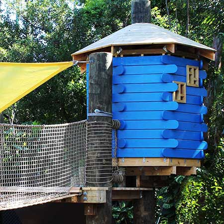 Treewalk Village is an environment where children and those who are young at heart can become explorers and climb from tree house to tree house through 8 ft tall hammocks, nets, and wood bridges!